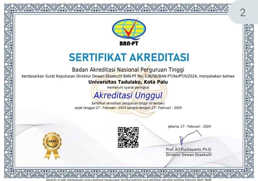 Universitas Tadulako mendapatkan akreditasi dengan predikat “Unggul” dari BAN-PT yang berlaku mulai tanggal 27 Februari 2024 s.d. 27 Februari 2029. (lih.berita)